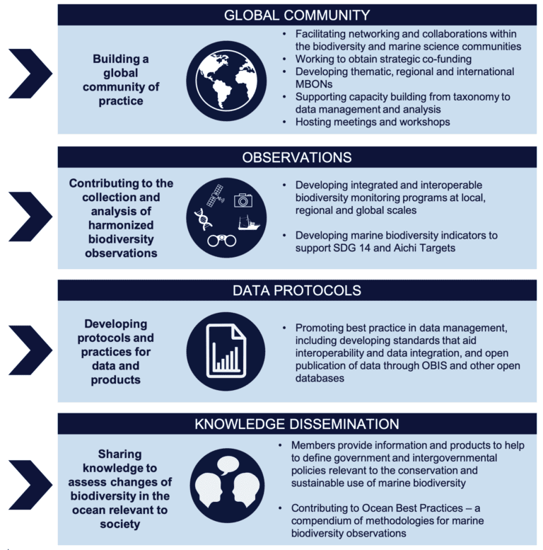 Foster and coordinate a global community of practice for collecting, curating, analyzing, good management, and communicating marine biodiversity data and related services to the scientific community, policymakers, the public, and other stakeholders.