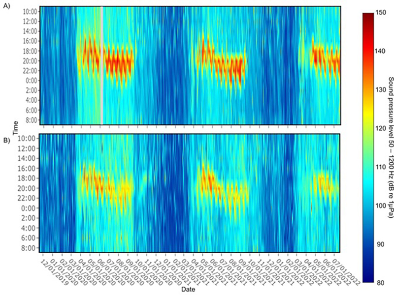 Figure 1. Temporal trends in received low frequency (50-1200 Hz) rms sound pressure levels (SPL) measured on the hour in A) Chechessee Creek and B) Colleton River, South Carolina, USA, from November 19th, 2019 to July 20th, 2022. (E. Montie, Unpublished data)