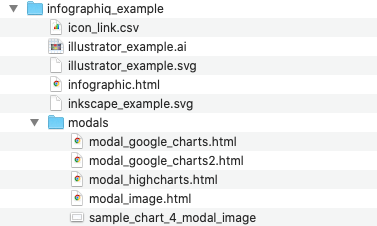 In this section of the guide, we discuss how to create these modal windows. To get started, if you haven’t do so already, download the example folder and unzip it. In the example folder, you’ll find a subfolder called “modals” that contains several HTML files (see image below).