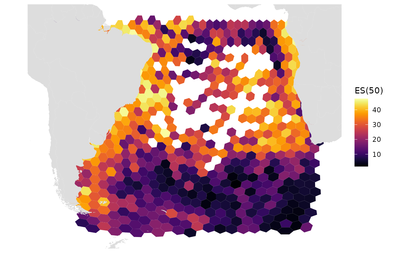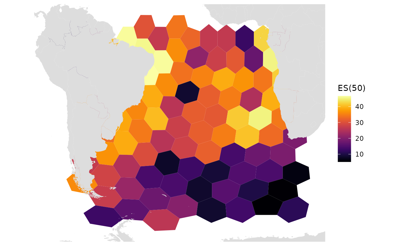 Here we plot res 6, which has hex areas of ~70,000 sq km.