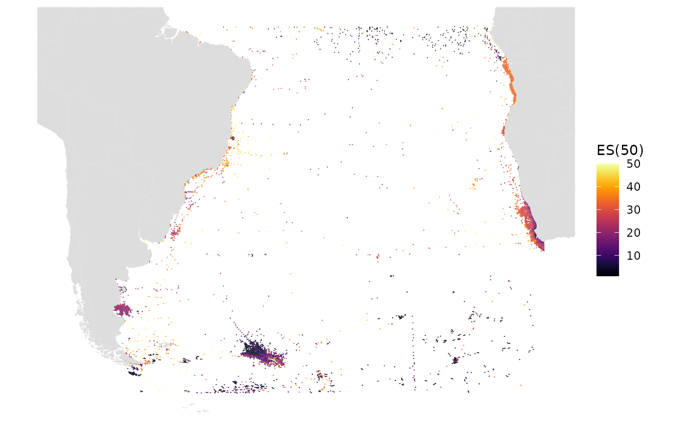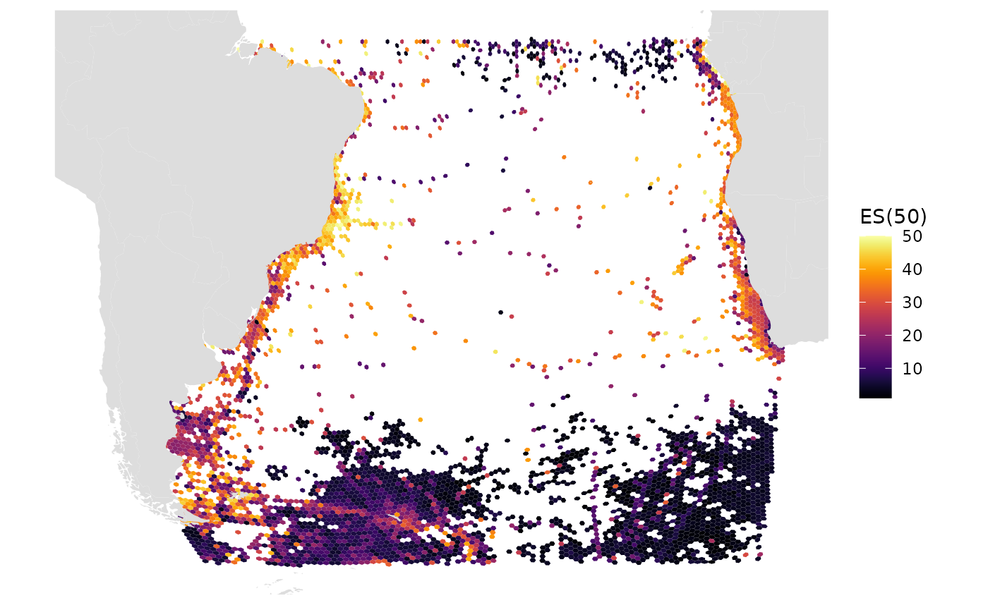 Here we plot res 4, which has hex areas of ~630,000 sq km This is the highest resolution we can plot without having gaps in the Central Atlantic Region