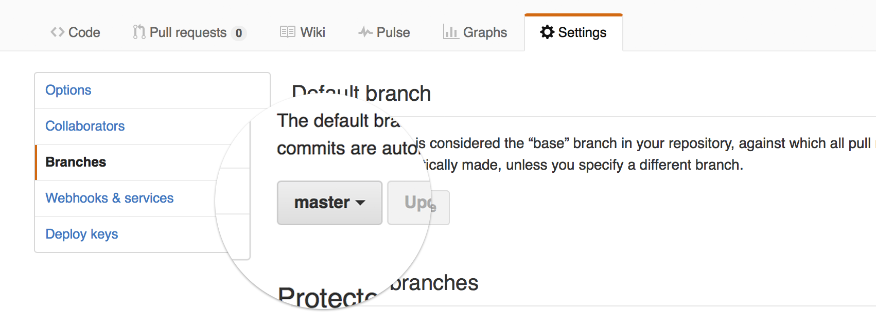 gh-pagesbranch will show up athttp://USER.github.io/REPO. For a user (or organization) site, the REPO must be namedUSER.github.io(orORG.github.io) and then the defaultmasterbranch will contain the web files for the websitehttp://USER.github.io(orhttp://ORG.github.io). See also User, Organization, and Project Pages - Github Help.Set the default branch to