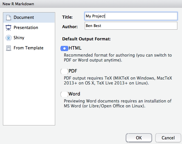 You can give it a Title of “My Project”. After you click OK, most importantly File -> Save as index (which will get named with the filename extension index.Rmd).